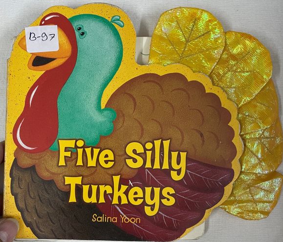 Watch the shiny feathers disappear as you count down from five to one in this Thanksgiving book about five silly turkeys!